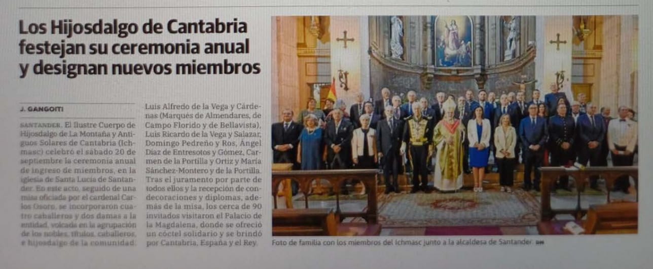 El pasado sábado 20 de septiembre, la iglesia de Santa Lucía de Santander acogió por quinto año consecutivo la ceremonia de ingreso de nuevos miembros del Ilustre Cuerpo de Hijosdalgo de La Montaña y Antiguos Solares de Cantabria (ICHMASC).